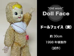 | ポップなお人形作品 『ドールフェイス(黄)』 1998年前後制作 全高30センチ イエロービスコース生地のお人形作品。 アメリカンキャラクターの影響を強く受けた作品です。 色白顔はアイボリー樹脂そのものの発色。 ソフビ人形等を意識した表現です。 おしりの布タグも初期のスタンプ押しタイプ。 【仕様】顔:レジンキャストを使用。 人形用ビスコースボア使用。 手はオーブン粘土製。経年変化のシミと汚れあり。 よだれかけ付き。 首、手足ディスクジョイント式。詰め物はワタ。 現在のロゴ(樹脂製)付属。 【状態】顔、手、よだれかけに若干汚れが目立つ印象。 |