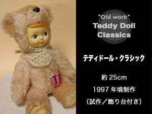 | 半ズボンワンコ 『はみがきDOG』 1997年前後制作 全高/約19.5センチ テディベアショップ「Bruin's Bruin」さんのコンテストに出品。 本来は歯医者に扮したベアとセットの作品です。 (歯医者ベアは紛失。犬のみ) オーブンネンドを使った初期の模索期らしい作品です。 【仕様】目、鼻(口)、小物類にオーブン粘土を使用。 布:ホワイトのディストレスモヘアを使用。 手足にハリガネ内蔵。(クネクネ可動式) 詰め物はワタ。現在のロゴ(樹脂製)付属。 【状態】きれいな状態ですが全体的に少し黄ばんだ印象。 【備考】記録違いにより年代は間違っている可能性があります。 |