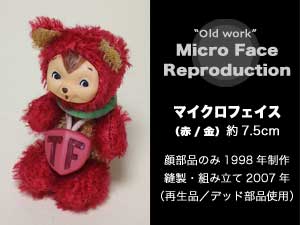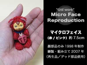 | 部品発掘!再生、極小フェイスベア 『マイクロフェイス/赤・ピンク』 部品1998年/縫製組み立て2007年 全高7.5センチ 未組み立ての「顔」(塗装済み)を2個ほど発見。 2007年に縫製組み立てを行いました。 この顔部品は試作の「表情試し塗り用」と記憶。 (部品自体質が少しばかり劣ります為) 本品は正面向きの表情です。ToyField最小作品。 【仕様】顔:レジンキャスト使用。 輸入モヘア使用。(ベリーショートにカットして使用) 首:ディスクジョイント式。 手足にワイヤー内蔵(折り曲げ可能) 詰め物:ワタ。現在のロゴ(樹脂製)付属。 【状態】<アップ画像参照> 顔部品は保管時の汚れが若干あります。 樹脂素材自体も「B品」らしく若干ムラが見られます。 ※画像中のグラスは付属しません |